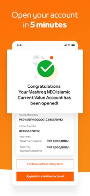 مشرف بچت اور کرنٹ اکاؤنٹس پر صنعت کی بہترین منافع بخش شرحیں فراہم کرتا ہے، جو آپ کے سرمائے کو مؤثر طریقے سے بڑھاتا ہے۔ ہمارے اسلامی بینکاری حل آپ کے شرعی اقدار کے مطابق تیار کیے گئے ہیں، جو مکمل اطمینان فراہم کرتے ہیں۔ روزانہ 10 ملین پاکستانی روپے تک کی منتقلی کی اعلیٰ حد کے ساتھ، آپ آسانی سے رقوم بھیج سکتے ہیں۔ یہ ایپ ڈیبٹ کارڈ کے حصول، فنڈز کی منتقلی، اور 4,000 سے زائد بلرز کو ادائیگی جیسی وسیع خدمات پیش کرتی ہے۔ پاکستان بھر میں 19,000 اے ٹی ایمز پر بغیر کسی اضافی چارج کے نقد رقم نکالنے کی سہولت بھی شامل ہے۔